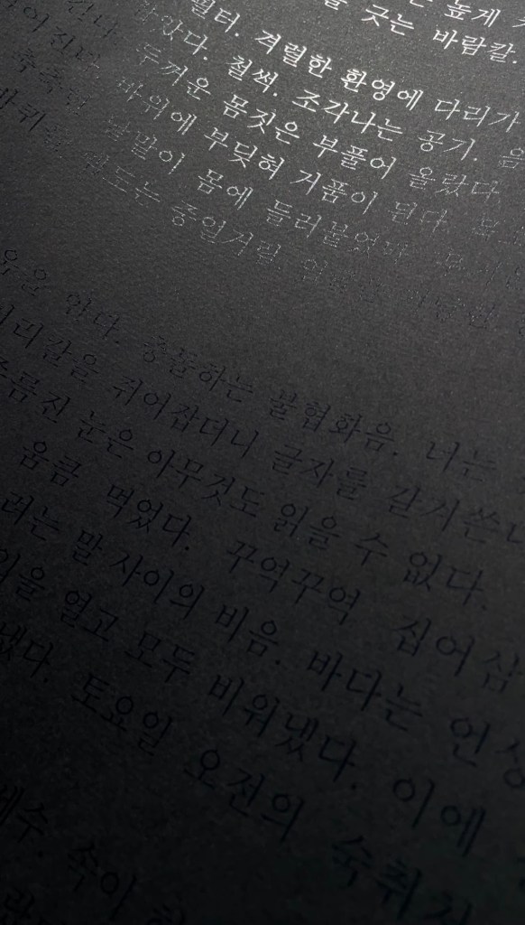 위 사진은 내 개인전<잔디는 따가운 송곳처럼>(2024)에서 공개한 작업이다. 이 작업은 검은 종이 위에 투명한 잉크로 글자를 인쇄했다. 투명 잉크는 검은 종이를 비추기 때문에 우리 눈은 인쇄된 글자를 볼 수 없다. 그러나 이 종이에 빛을 비추면, 잉크가 빛을 반사해 글자가 밝게 빛난다. 빛이 있어야만 글을 읽을 수 있는 작업이다.